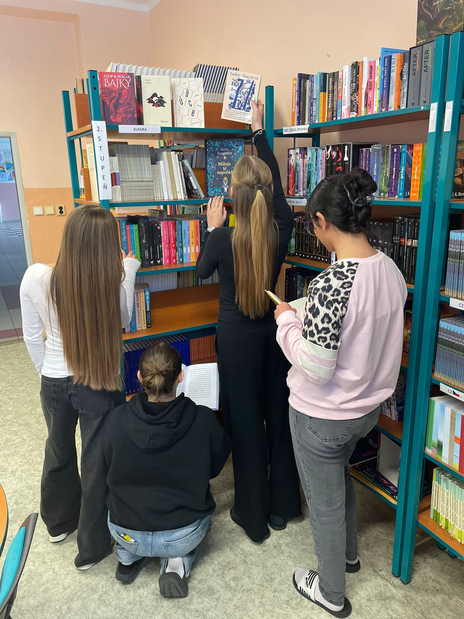 S vybalováním a rovnáním knih do polic mi ochotně pomohly žákyně, které si nové knížky s radostí prohlížely, listovaly jimi a obdivovaly jejich obálky. Bylo krásné sledovat jejich zaujetí a opravdový zájem o čtení.
